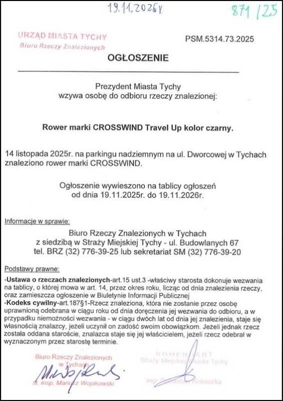 14 listopada 2025r. na parkingu nadziemnym na ul. Dworcowej w Tychach znaleziono rower marki CROSSWIND