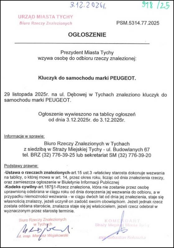 29 listopada 2025r. na ul. Dębowej w Tychach znaleziono kluczyk do samochodu marki PEUGEOT.